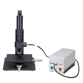 8″ x 8″ Stage with SS-3 lens and 40mm of precision X-Y-Focus travel. Can be upgraded to motorized mapping and autofocus.